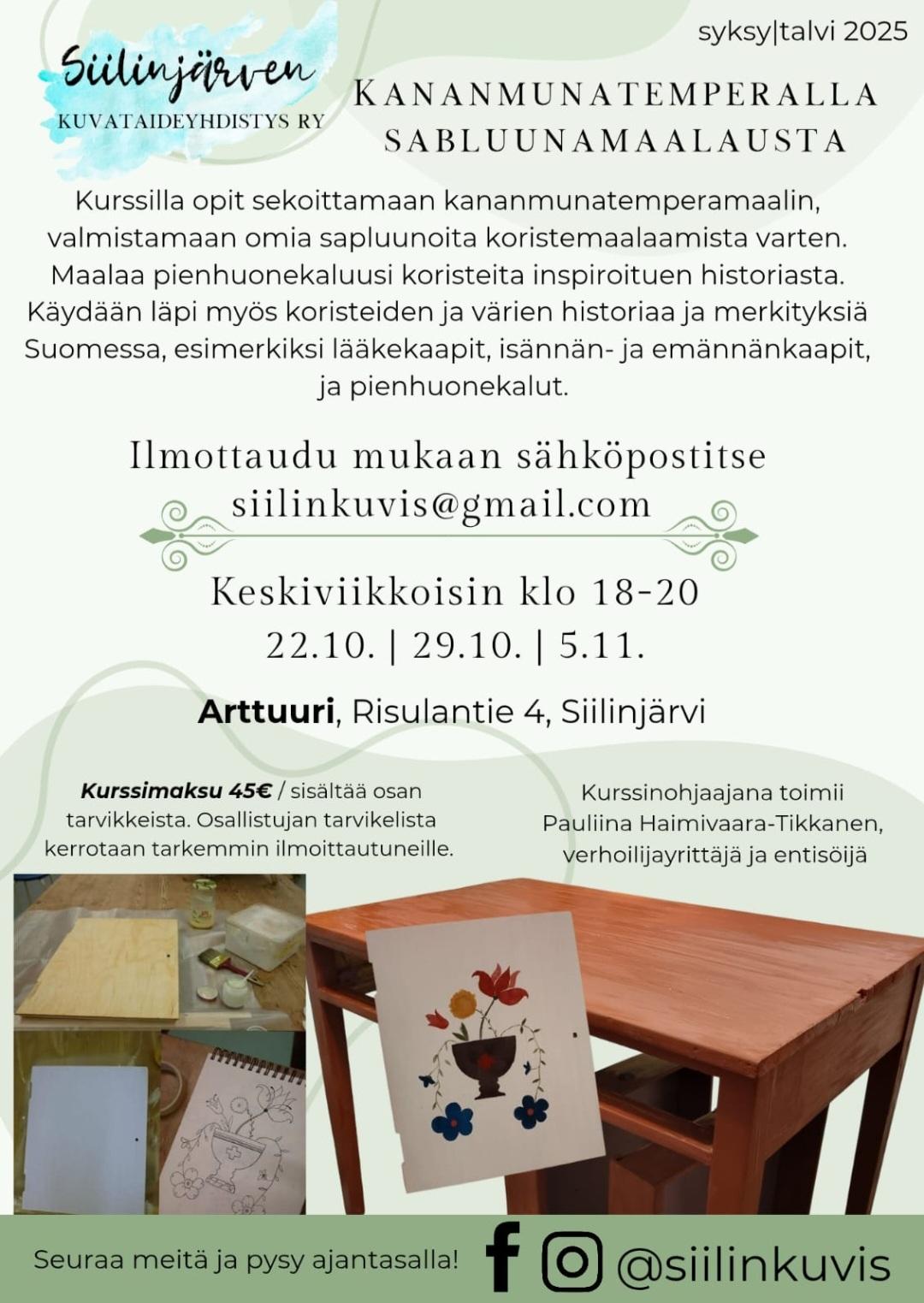 Kurssi sopii pidempään maalanneille, jotka haluavat oppia erikoistekniikkaa. Aloittelijat ovat tervetulleita myös ja opastamme mielellämme alkuun mukaan.